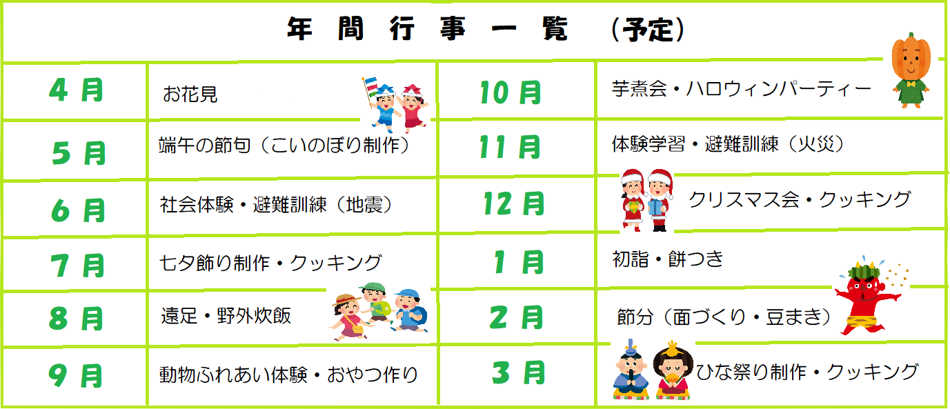 | 学校へお迎え 自由時間(宿題) はじまりの会 集団活動(室内外) おやつ | 14:00 | 集団活動 (散歩・創作・ゲーム・おやつ作り...など) おやつ 自由時間 |